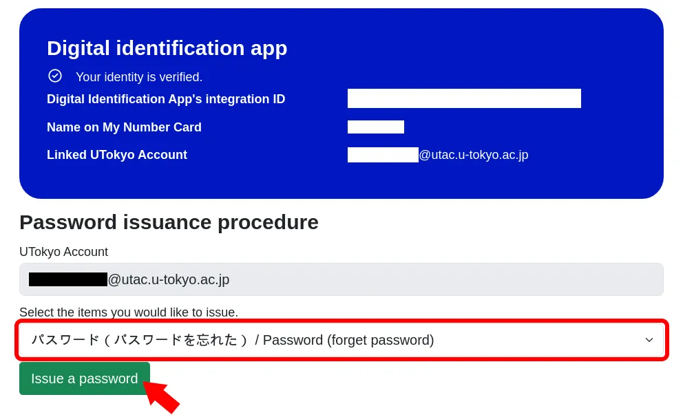 By pre-linking the UTokyo Account Identity Verification Service, you can verify your identity online using your My Number Card and reissue your password by yourself. This service allows you to complete the procedure without visiting an office in person. For details, please refer to “UTokyo Account Identity Verification Service.”