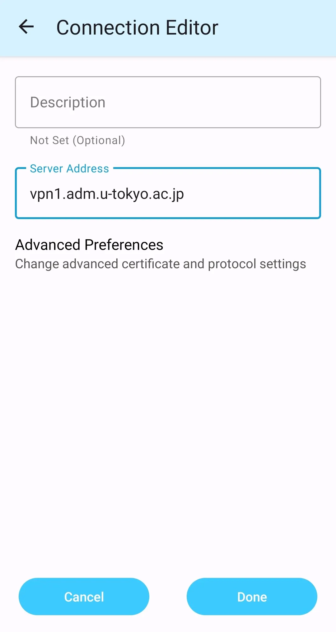Step C: Tap “Connections” and tap the plus “+” button in the lower right corner. The “Connection Editor” will appear as shown below. Tap “Server Address” and enter “vpn1.adm.u-tokyo.ac.jp”.