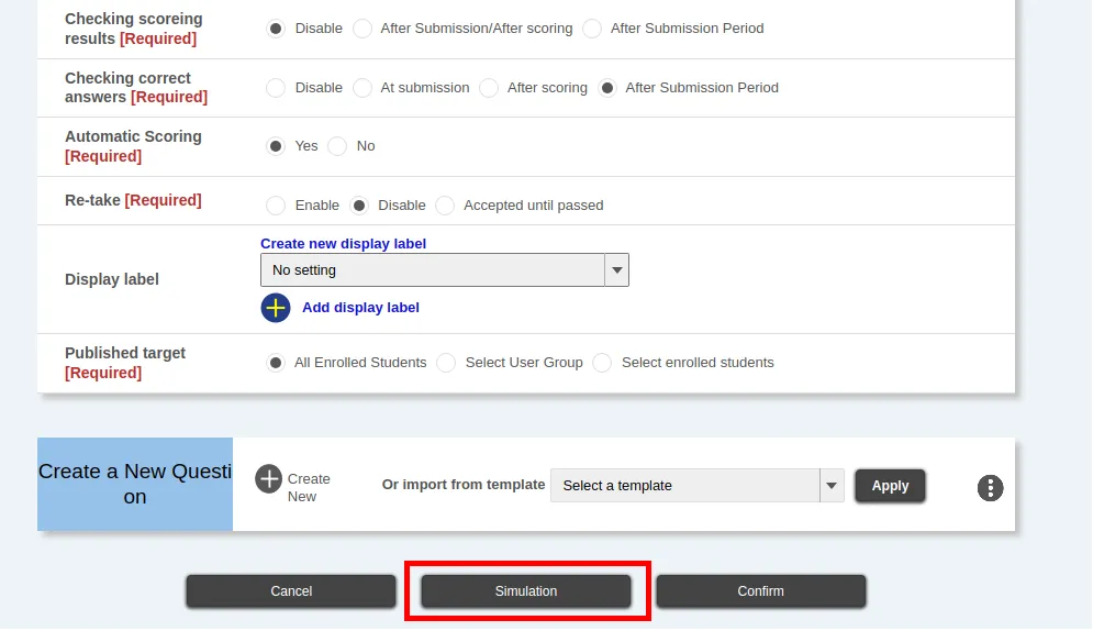 After creating a test, you can use the “test simulation” function to check how it will look when students take it. We recommend that you use this function to check that the test can be appropriately answered from the test-takers’ perspective and that there are no questions that cannot be answered other than just from the perspective of the test creator.