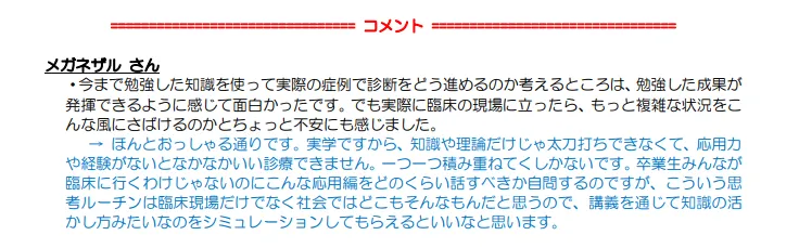 学生からの質問がなければ、双方向性を担保できなくなってしまうので不安でした。ですが、毎回、10 ~ 15 人から感想や質問が届きました。 鋭い質問や教員が唸るようなコメントが多く、大変よい質疑応答になりました。これまでの対面授業よりも、ずっと多くの反響がありましたし、手応えがあったという印象を持っています。