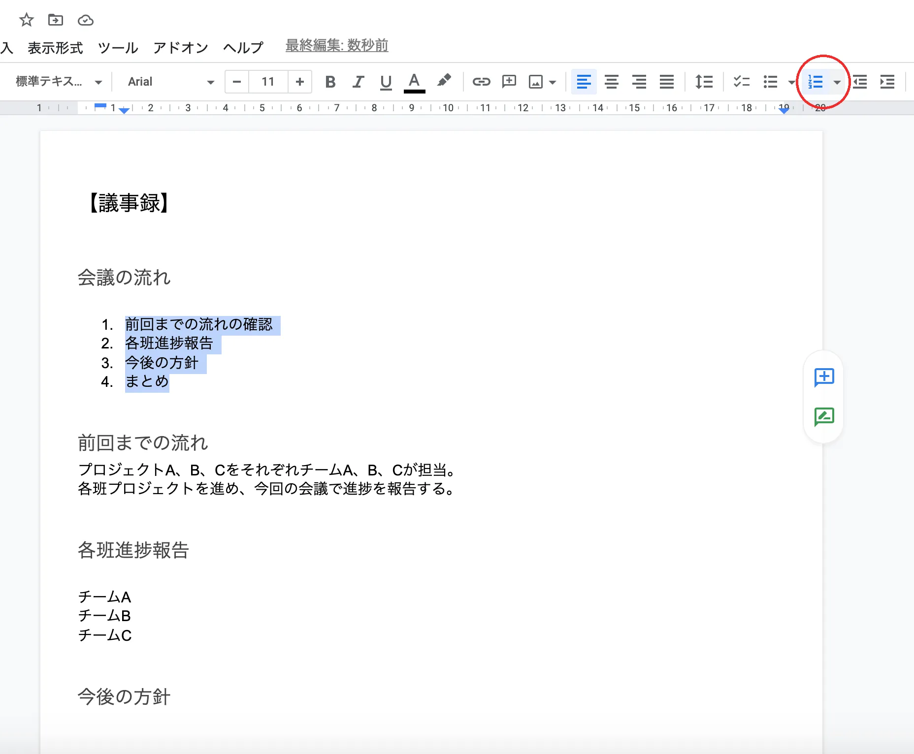 もしくはWindowsでは「Ctrl+Shift+7」,Macでは「⌘+Shift+7」のショートカットキーを用いて「番号付きリスト」を設定することもできます.