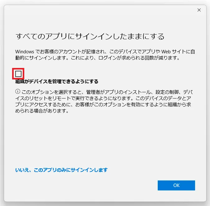 - Windows端末の場合,「すべてのアプリにサインインしたままにする」というダイアログが表示されることがあります.ここでの設定内容によっては,Officeアプリの利用中にエラーメッセージが発生しうることが確認されています.これを防ぐため,以下のように回答してください.