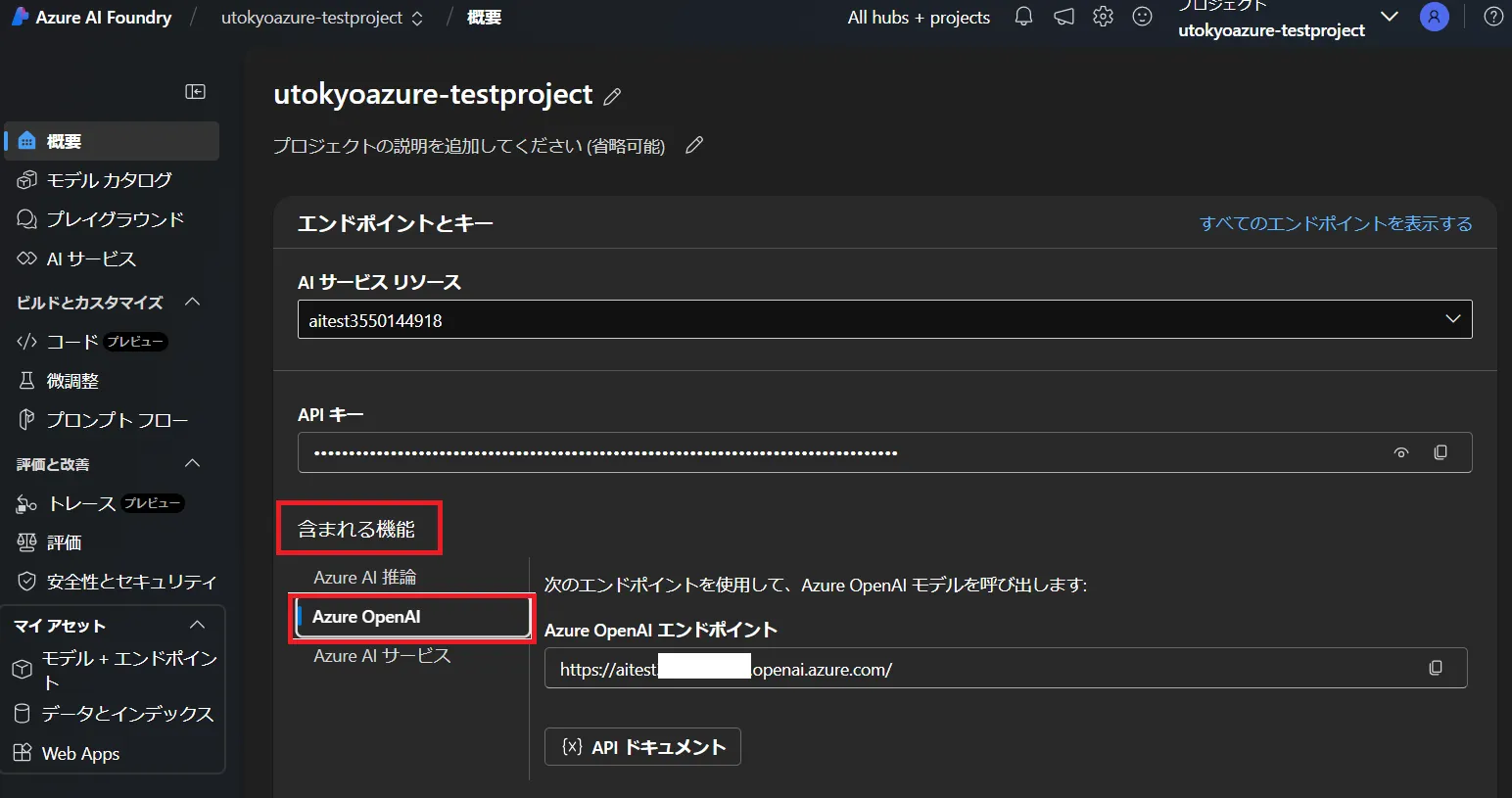 • Azure OpenAI Studio または Azure AI Foundry の概要に API キー及びエンドポイントの表示があります.これらをコピーしてください.