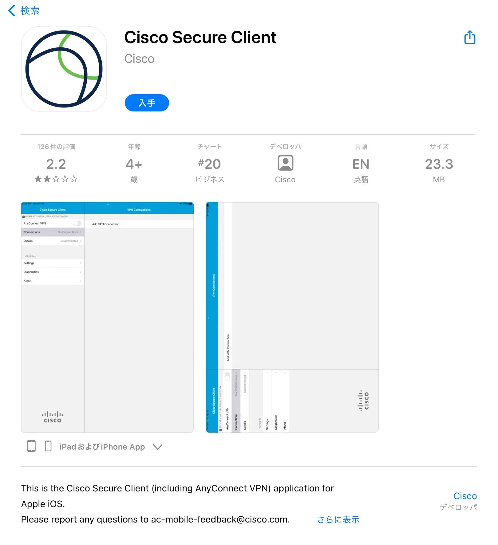 手順A: App Storeにアクセスし,Cisco社のCisco Secure Clientというアプリをインストールします.