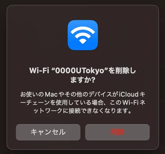 手順2でアカウント名とパスワードを入力する画面が表示されず,接続にも失敗した場合は,既存の設定情報をいったん削除し,新しい設定情報を登録しなおす必要があります.なぜならば,アカウントを再発行すると従前のアカウントは使用できなくなりますが,端末はこの以前のアカウントのことをいわば「覚えて」しまっているからです.新しいアカウントを使用する前に,使用できなくなった古いアカウントのことを「忘れさせる」操作が必要です.「『削除』してしまうと二度とUTokyo Wi-Fiに接続できなくなってしまうのではないか」という心配は無用です.手順2で見つけたSSIDを選択し,表示された画面で「このネットワーク設定を削除する」を選択してください.「Wi‑Fi “0000UTokyo”を削除しますか?」という画面が出てくるので,「削除」を選択してください.