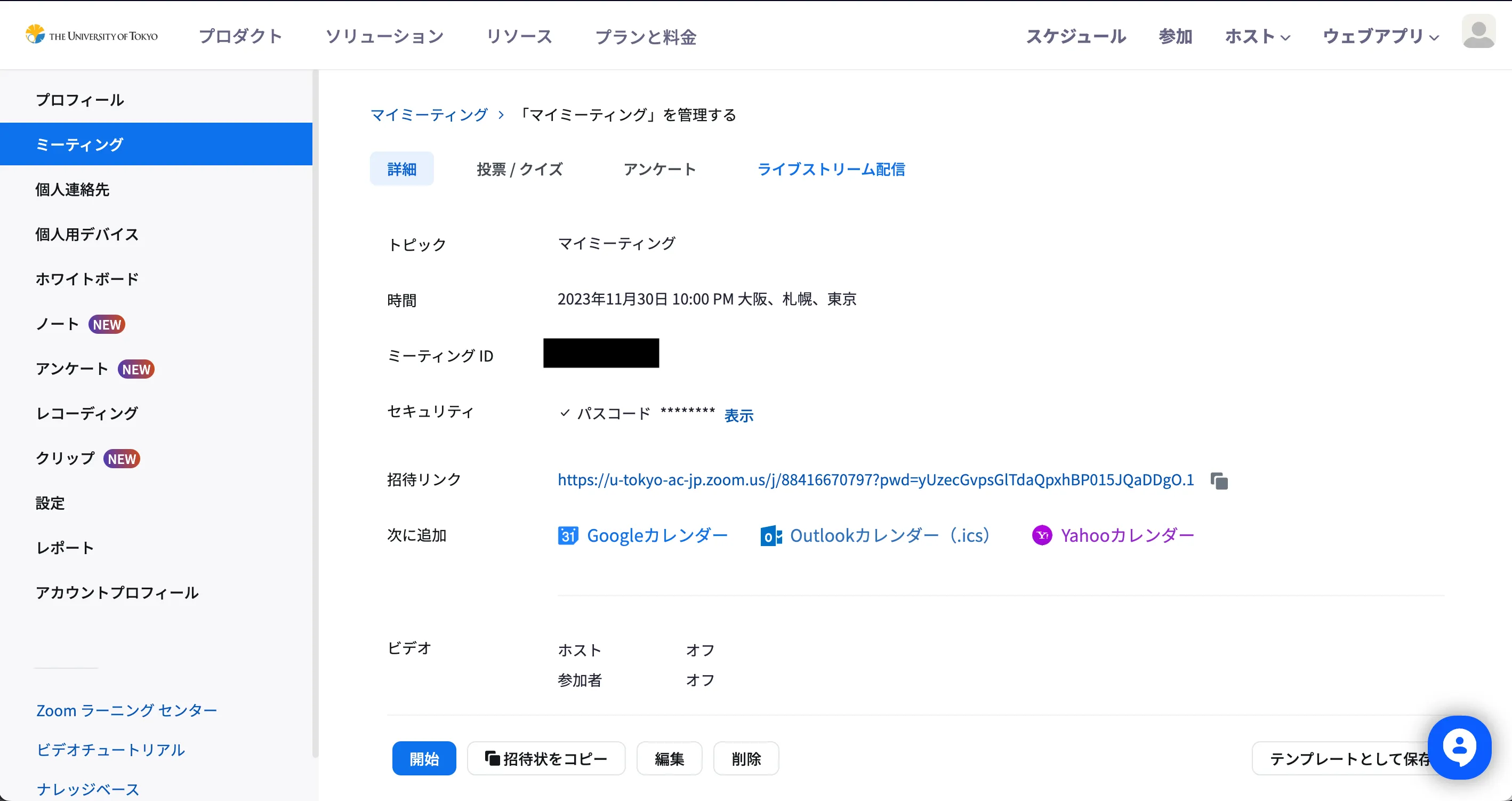 - 作成されたミーティングの詳細の画面が表示されます.あなたが先ほど設定した通りに作られていることを確認してください.