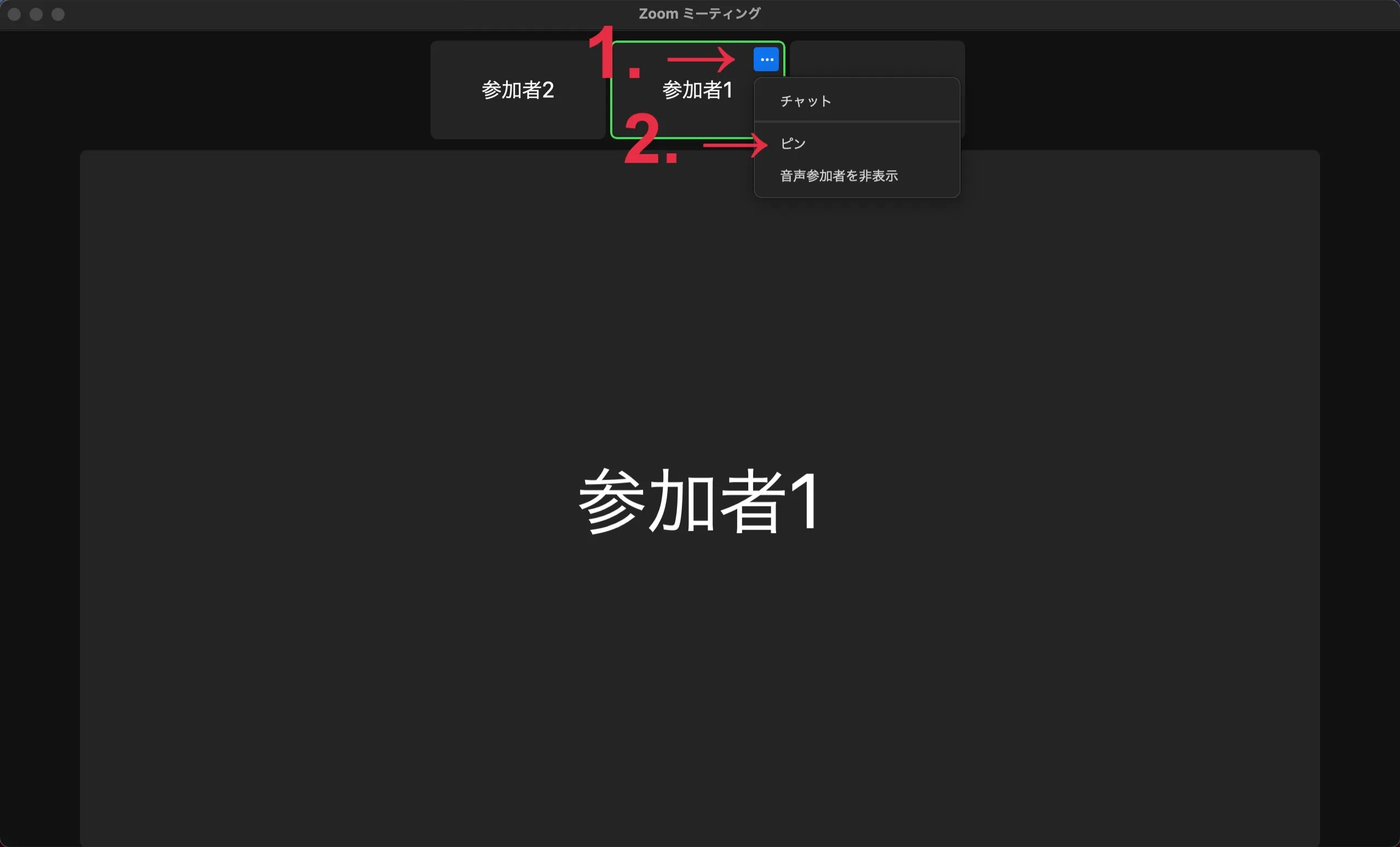スピーカービューの状態で,特定の参加者を大きく表示させ,切り替わらないようにするピン留めという機能があります.以下が設定手順です.