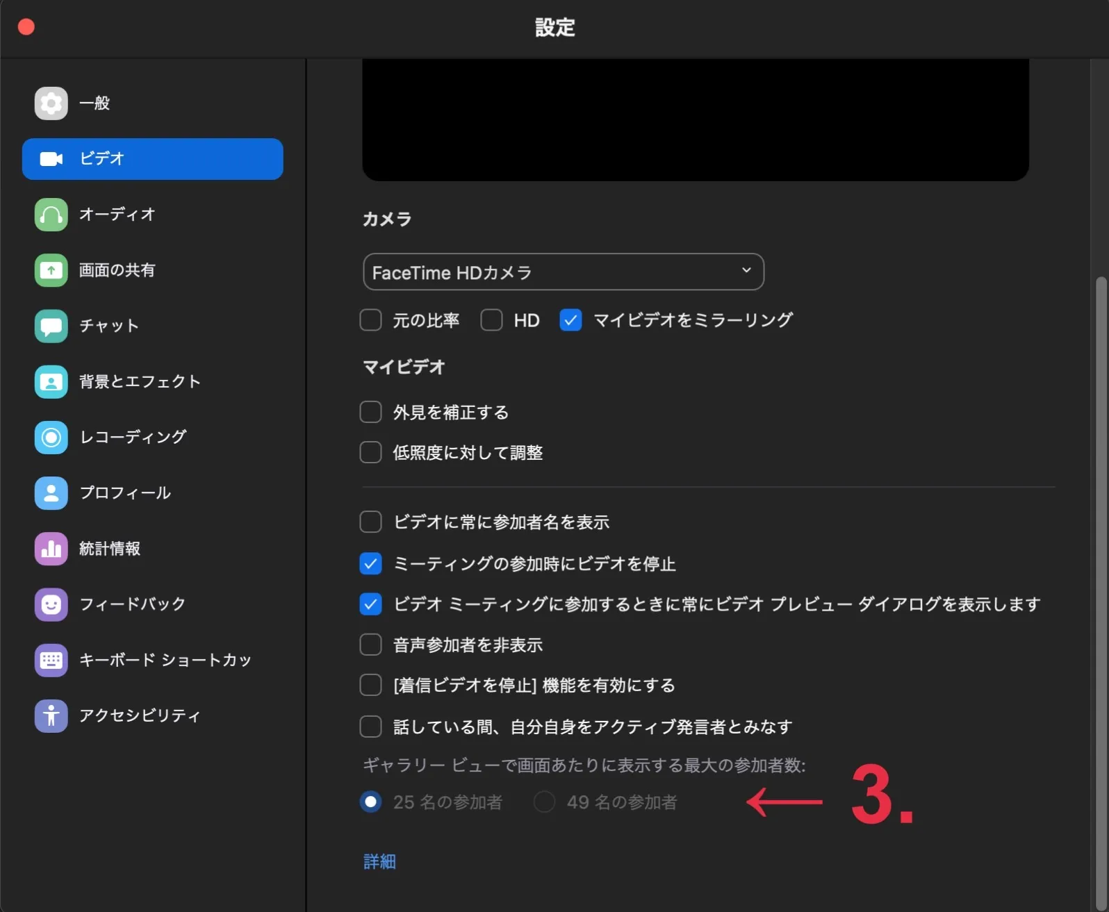 - 「ギャラリービューで画面当たりに表示する最大の参加者数」で最大人数を選択してください.