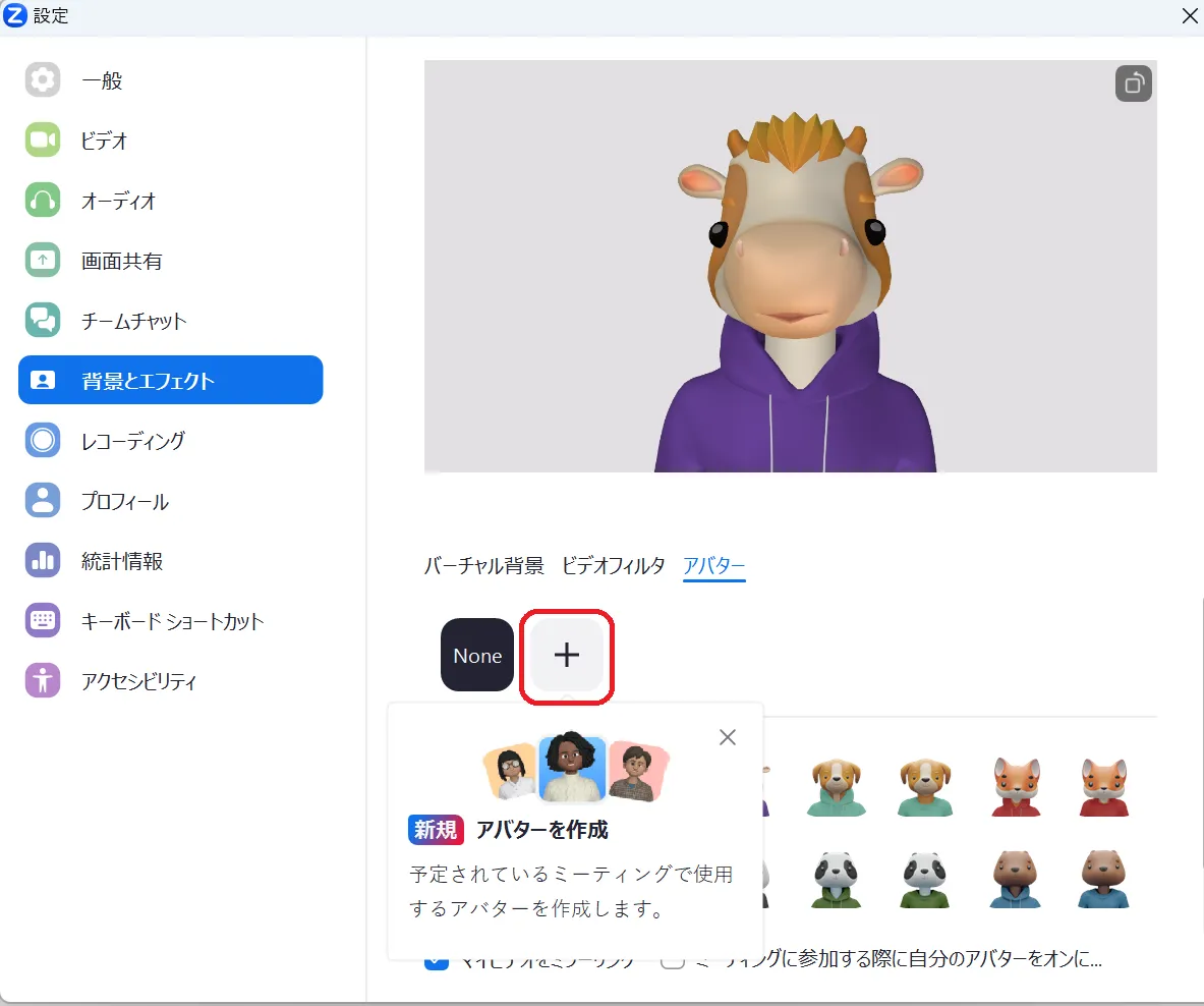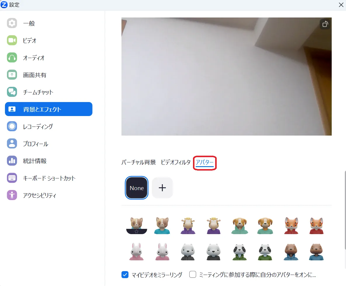3. 好みのアバターを選んでください.(アバターを設定するとカメラに映る背景が表示されなくなり,アバターだけが表示されるようになります.バーチャル背景を設定している場合は設定している画像がアバターの背後に表示されます.)